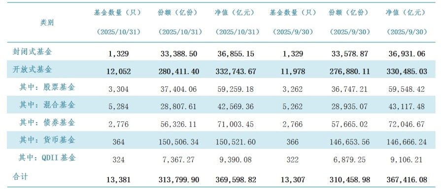 与此同时,公募基金产品数量迭创新高,截至 10 月底,公募基金产品数量为 13381 只,较 9 月底再增加 74 只。