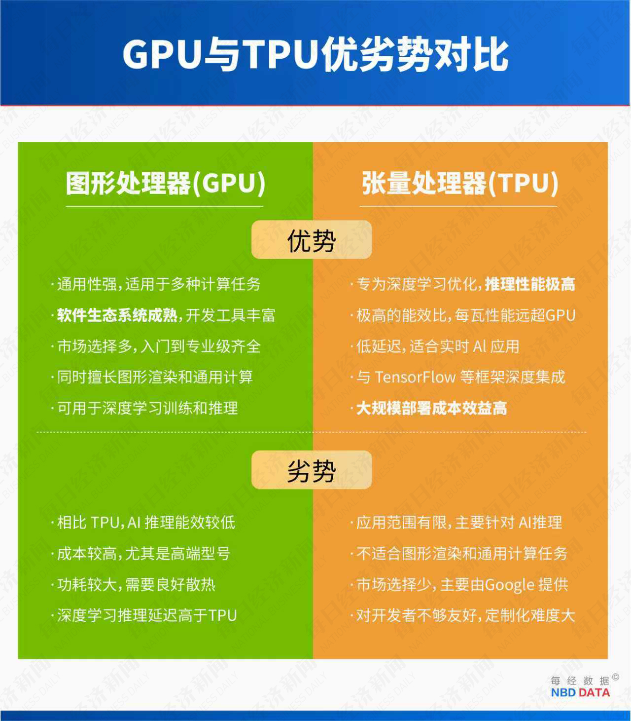 AI 专用芯片 (TPU,张量处理单元) 与通用处理器 (GPU,图形处理单元) 的技术路线之间的差异,决定了各自的市场定位与竞争力。