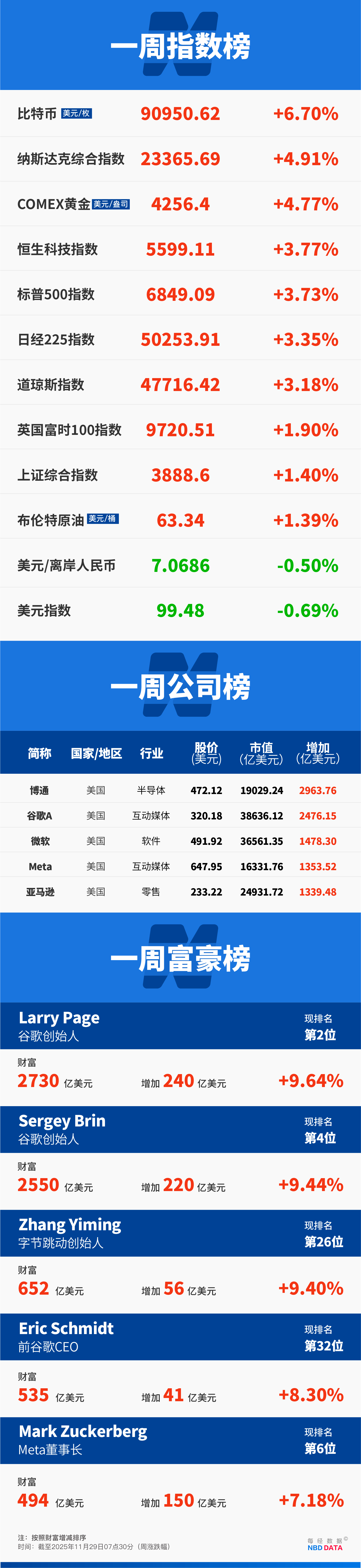 大宗商品方面,金属价格周五飙升,白银和铜均创下纪录新高。现货白银价格突破每盎司 56 美元,伦敦期铜一度上涨 2.5%,触及纪录新高每吨 11210.50 美元。11 月,现货白银累涨 15.25%,连续七个月上涨。分析认为,由于市场对美联储在 12 月降息的预期升温、资金流入以实物白银为支撑的 ETF,再加上供应持续紧张,使白银价格获得了强劲支撑。