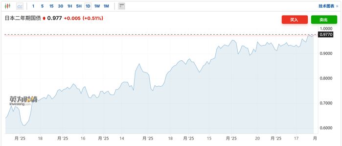 另一个需求疲软的信号是尾部差价 (平均中标价格与最低中标价格之差) 达到 0.012,而 10 月的前次拍卖仅为 0.002。受此消息影响,日本两年期国债小幅下跌,收益率升至 0.977%,创 2008 年以来的最高水平。