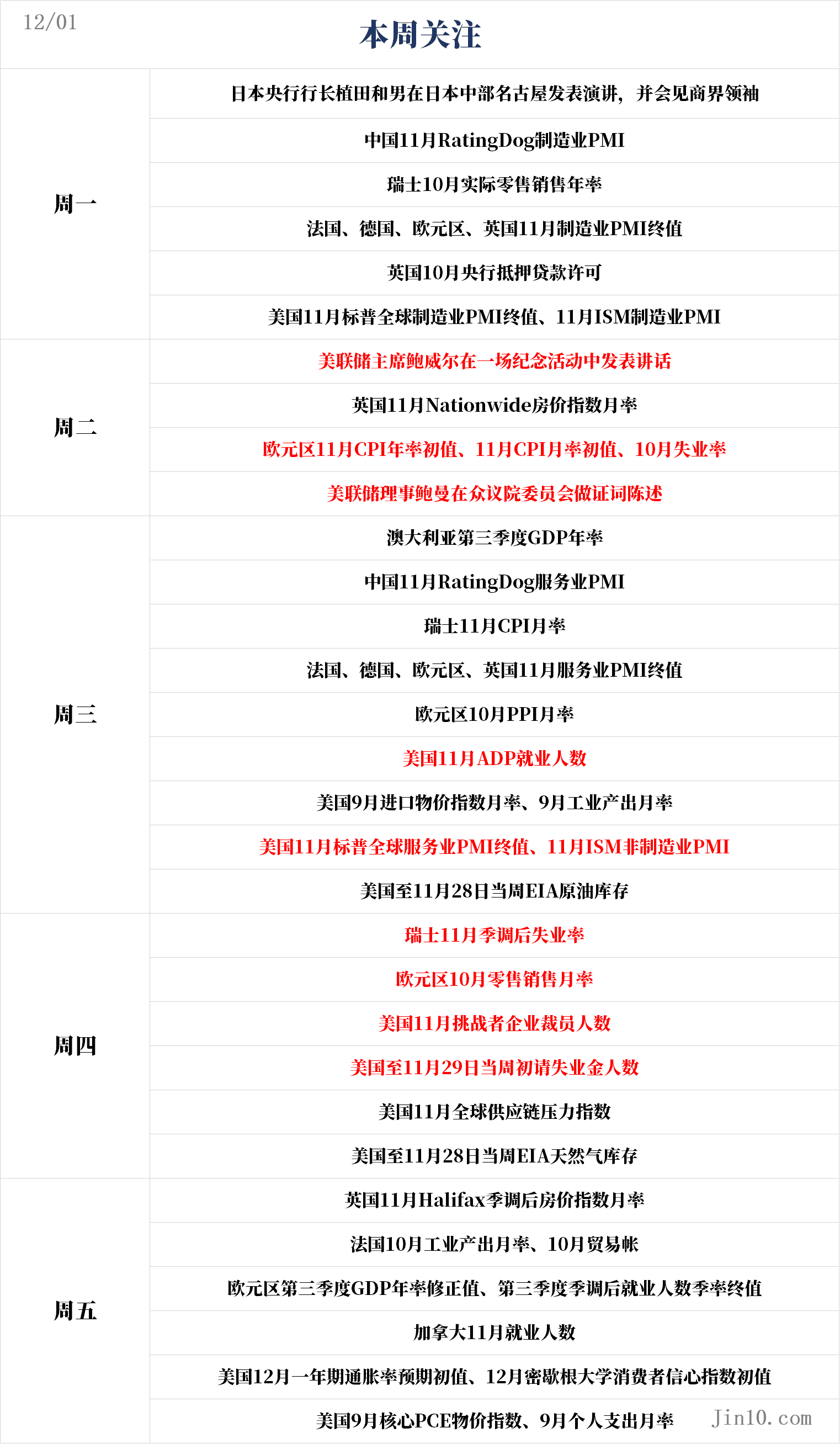 周一 23:00,美国 11 月 ISM 制造业 PMI;
