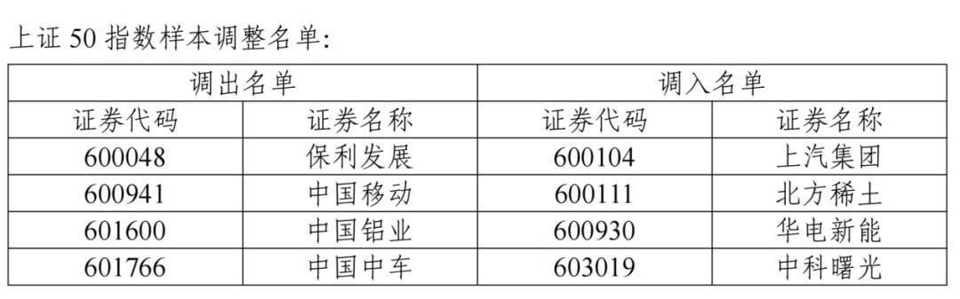 其中上证 50 指数更换 4 只样本,调入上汽集团、北方稀土、华电新能、中科曙光;保利发展、中国移动、中国铝业、中国中车被调出。
