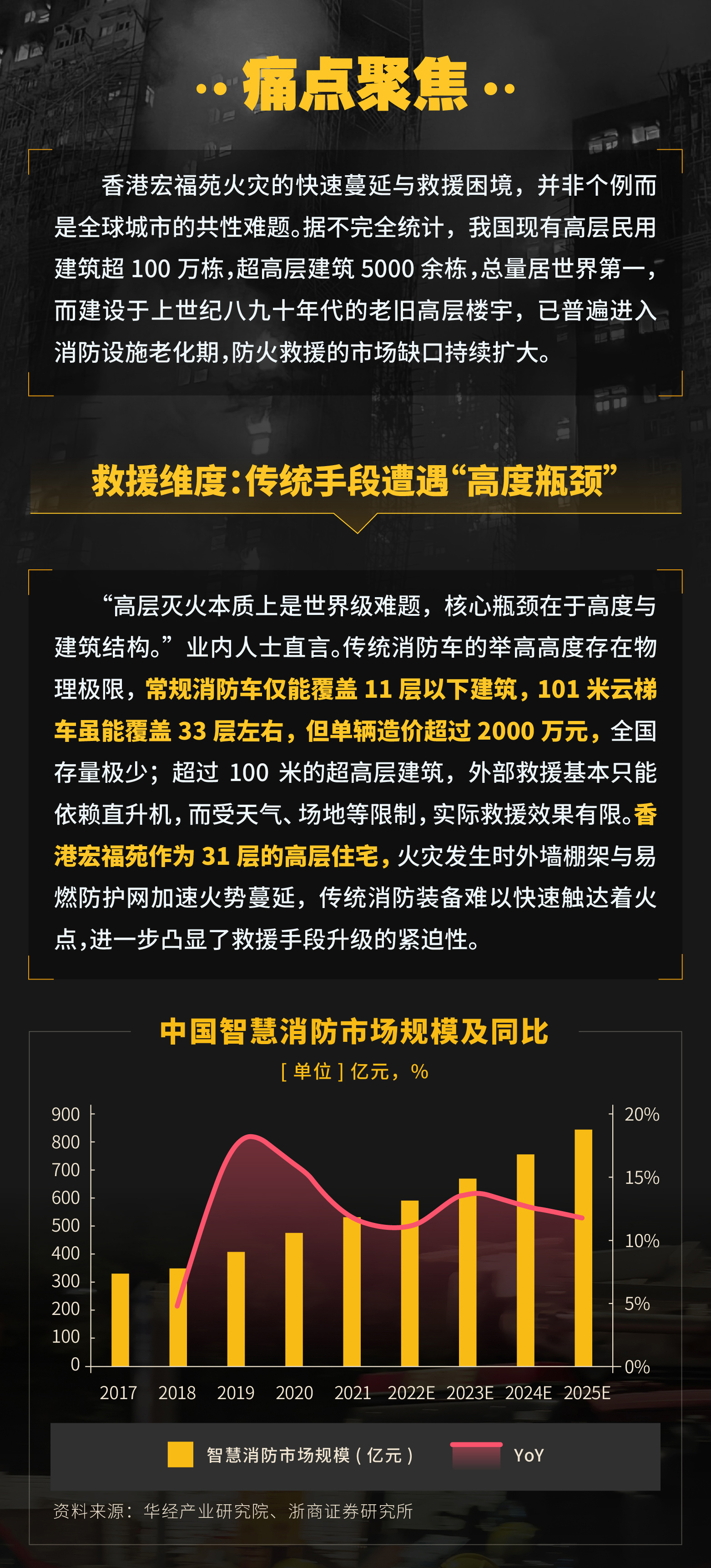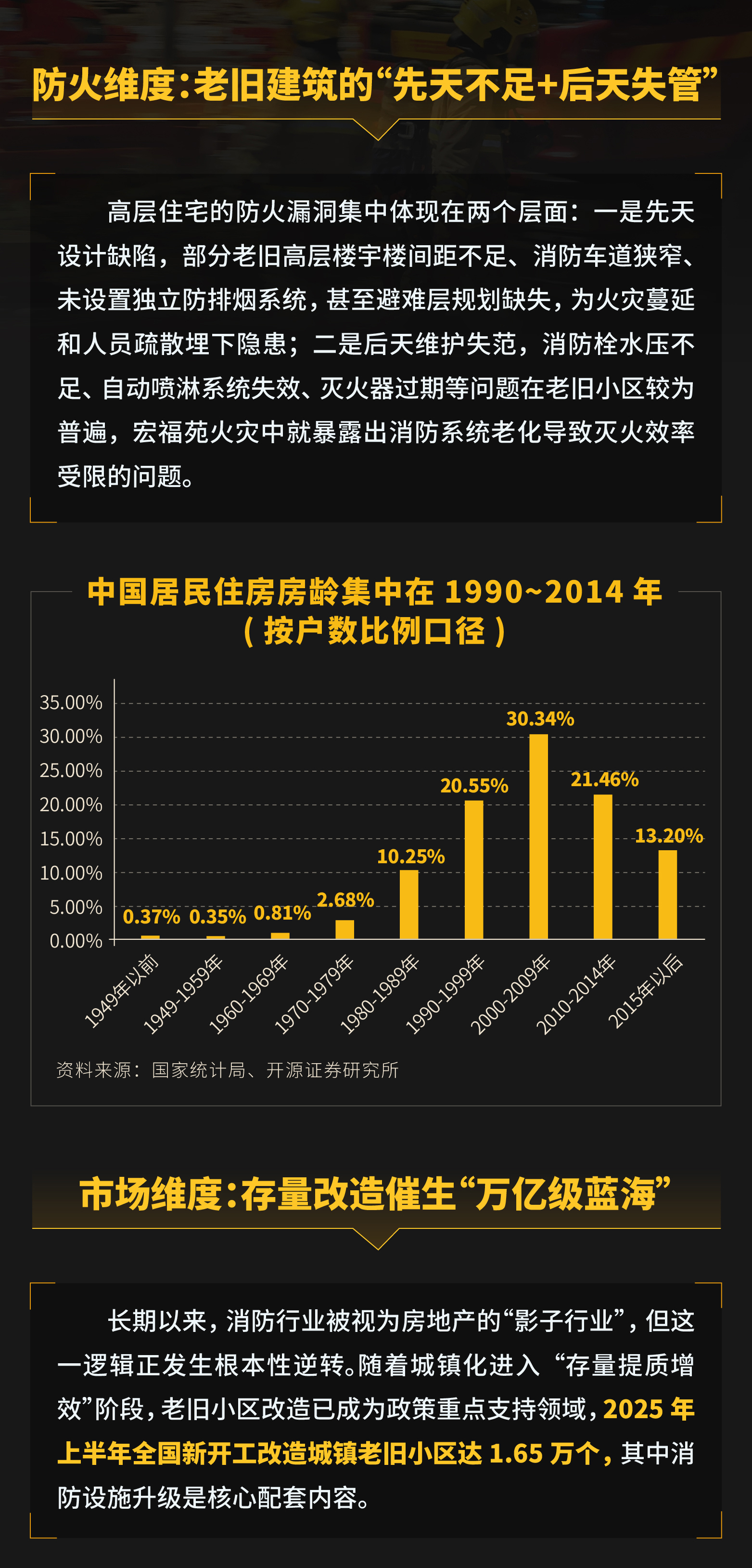 2025 年 11 月 26 日,香港大埔宏福苑那场五级大火,不仅带来了沉痛的生命损失,更将高层住宅防火与救援这一 「世界级难题」 再度推向公众视野。从财经视角审视,这场悲剧既是对城市老旧建筑安全治理的拷问,也意外揭开了消防行业的新逻辑——当城镇化进入存量提质阶段,「城市变老」 催生的防火救援升级需求,正推动 A 股消防板块走出地产 「影子行业」,市场正逐渐认识到其独立的产业价值。