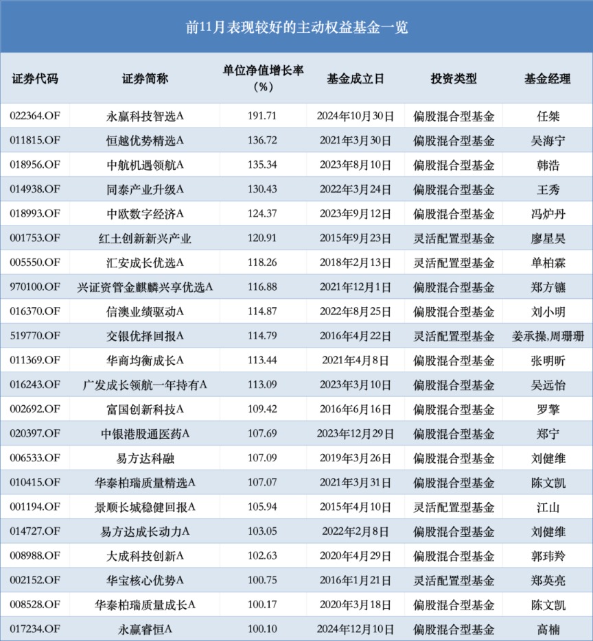 在这样的基础市场下,前 11 月主动权益基金净值增长率平均达到 27.48%,最牛基金业绩超 191%。