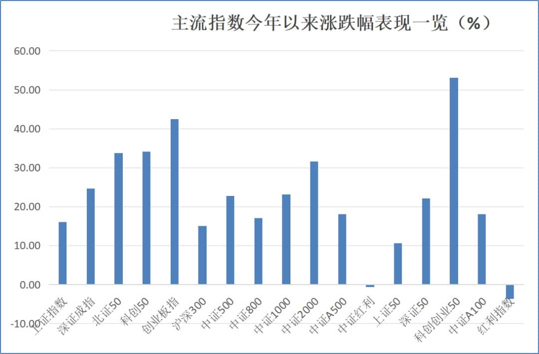 具体来看,主流指数前 11 月基本维持上涨行情,其中科创创业 50、创业板指等指数表现神勇,年内涨幅均超 40%,分别达到 53.17%、42.54%;科创 50、北证 50、中证 2000 等指数也表现强势,涨幅超 30%。不过,中证红利指数、红利指数出现小幅下跌。