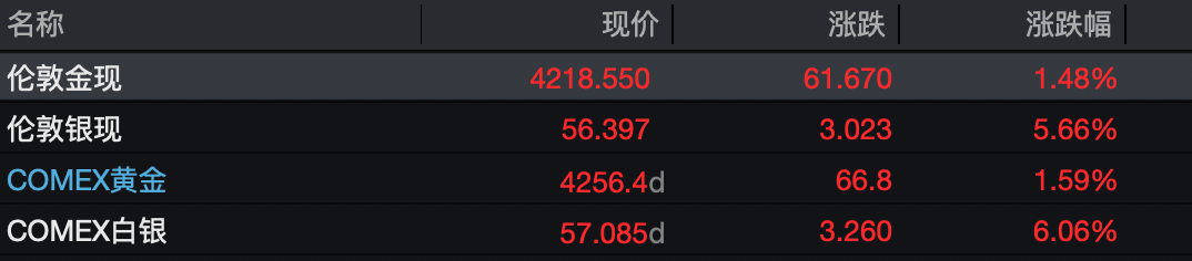 北京时间 11 月 28 日晚间至 11 月 29 日凌晨,国际金价持续走高,现货黄金、COMEX 黄金价格均重新站上 4200 美元/盎司。截至收盘,伦敦金现涨 1.48%,报 4218.55 美元/盎司;COMEX 黄金报 4256.4 美元/盎司,上涨 1.59%。