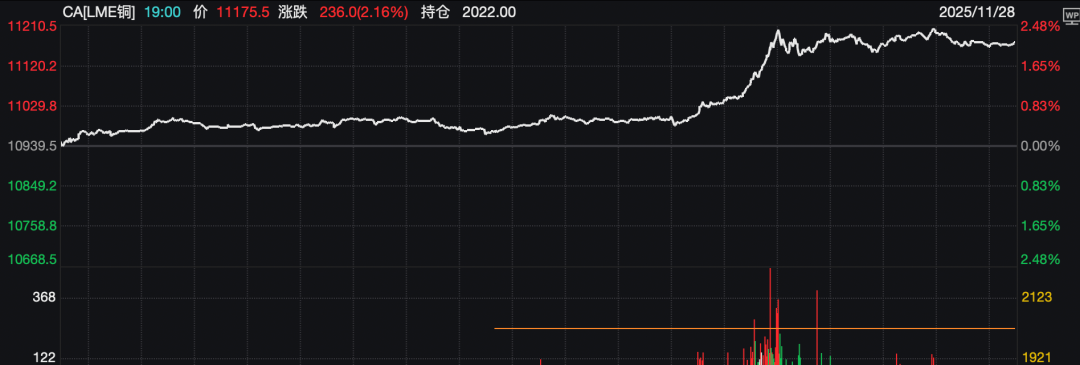 铜价亦创历史新高。行情数据显示,LME 铜盘中一度上涨近 2.5%,达到每吨 11210.50 美元,触及记录新高。