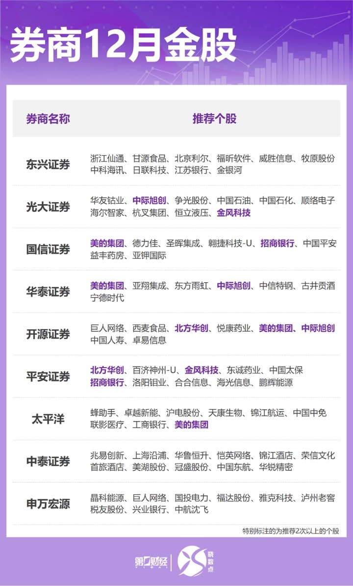 11 月 A 股市场呈现震荡调整格局,沪指累计跌 1.67%,深证成指累计跌 2.95%,创业板指累计跌 4.23%。12 月如何寻找机会?截至发稿,近 10 家券商公布了 12 月月度投资组合,涉及金融、信息技术、消费等多个领域。