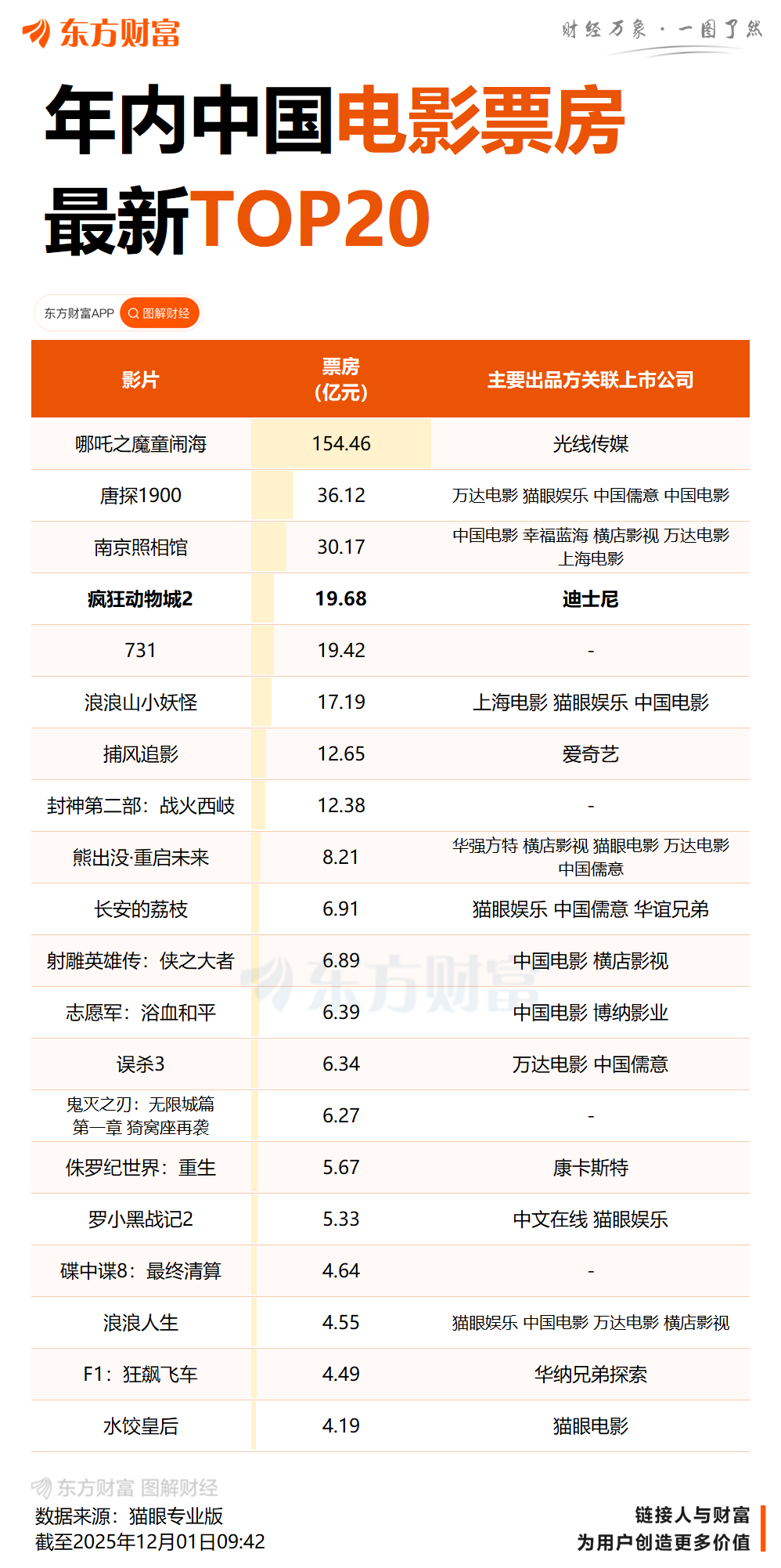 此外在观影人次方面,11 月 29 日 19 时 40 分,《疯狂动物城 2》 的单日观影人次已达到 1765.4 万,超过今年 2 月 4 日由 《哪吒 2》 创下的单日 1732.28 万人次的纪录,刷新中国影史动画电影单日观影人次纪录。