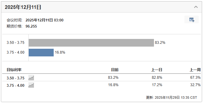 目前交易员们正在加大力度押注美联储将在 12 月议息会议进一步降息。据 CME「美联储观察」,截至北京时间 12 月 1 日 11 时,美联储 12 月降息 25 个基点的概率升至 83%。另外,摩根大通也火速 「撕报告」,该行目前认为美联储将于 12 月降息,改变了一周前关于美联储将推迟降息至明年 1 月的判断。