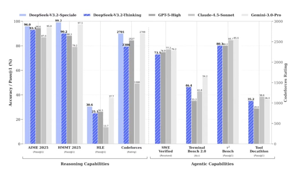 DeepSeek-V3.2 具备指令跟随、数学证明与逻辑验证能力,在主流推理基准测试上的性能表现媲美 Gemini-3.0-Pro。