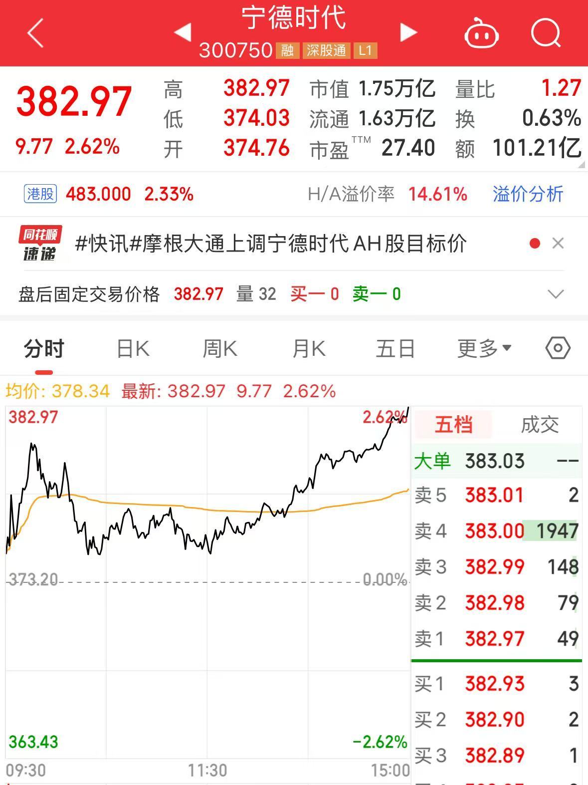 12月1日,宁德时代A股尾盘拉升,收于382.97元/股,涨幅为2.62%,总市值为1.75万亿元。