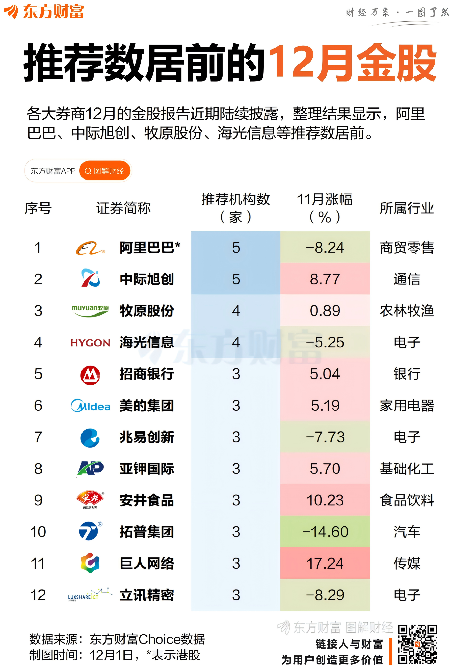 券商 12 月份金股策略报告近日陆续披露。据不完全统计,截至 12 月 1 日,超 190 只 A 股及港股标的入围了当月的券商 「金股」 名单,其中,获得 3 家及以上券商推荐的金股数量共计 12 只。