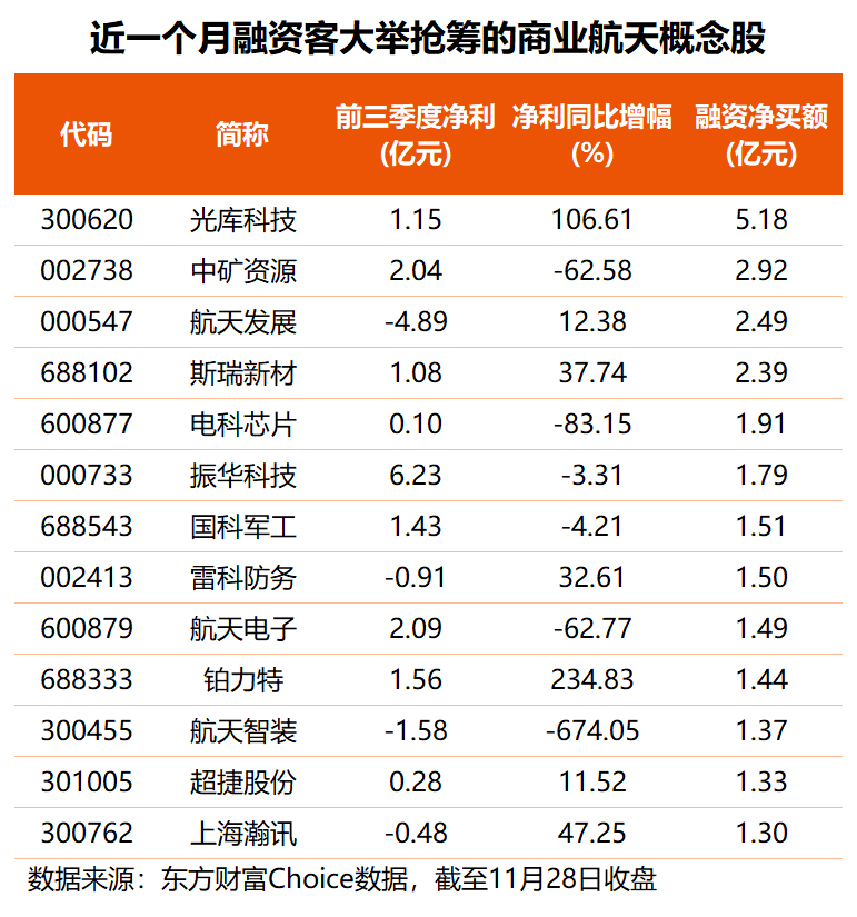 其中,光库科技获融资客抢筹 5.18 亿元,公司前三季度净利同比增逾一倍。中矿资源融资净买额近 3 亿元,航天发展、斯瑞新材均有逾 2 亿元融资净买入,雷科防务、航天电子、航天智装等 14 股融资净买额在 1 亿至 2 亿元之间。