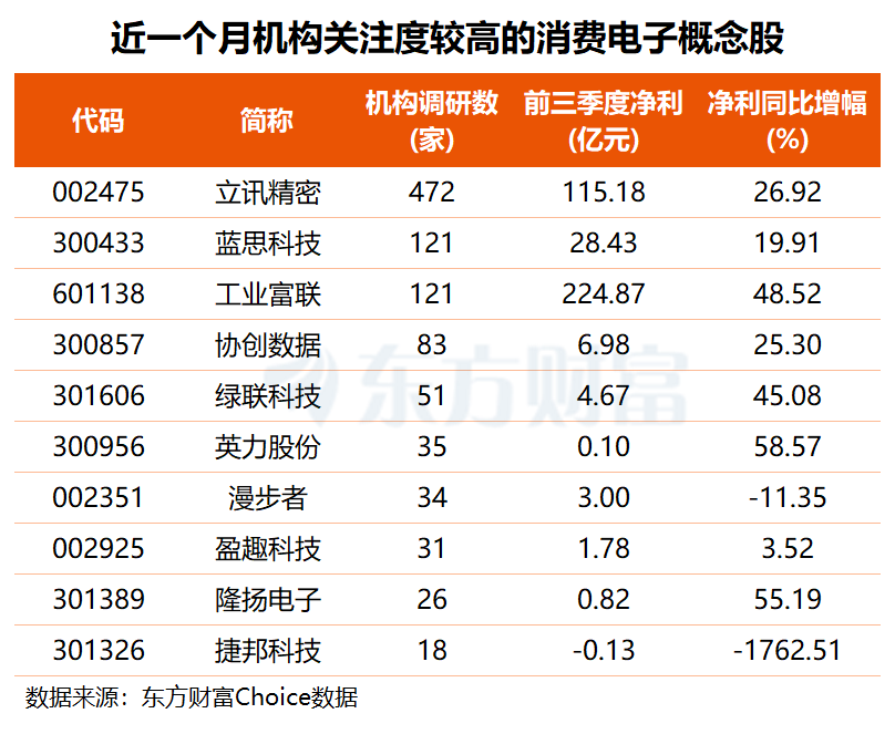 东方财富Choice 数据显示,近一个月以来,多只消费电子概念股获机构密集调研,其中,龙头股立讯精密获 472 家机构集中调研,蓝思科技、工业富联均获 121 家机构调研。