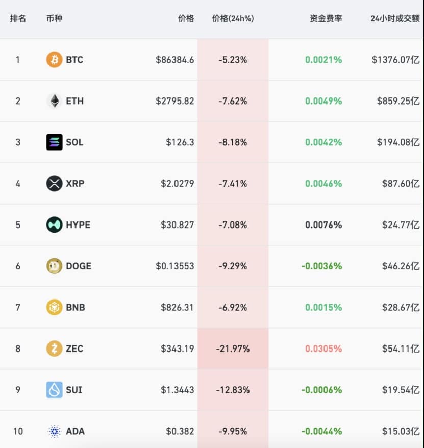 消息面上,加密货币亦遭遇猛烈抛售,比特币一度跌破 8.4 万美元,最低跌至 8.38 万美元,截至发稿,比特币大跌超 5%,以太坊、XRP、HYPE 大跌超 7%,DOGE 币暴跌超 9%,ZEC 币暴跌超 21%。