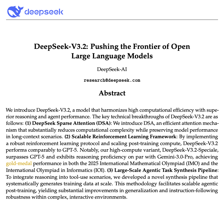 DeepSeek-V3.2 的关键技术突破就包括上述 3 项:引入 DSA 稀疏注意力机制、可扩展的强化学习框架、大规模 Agent 任务合成流程。