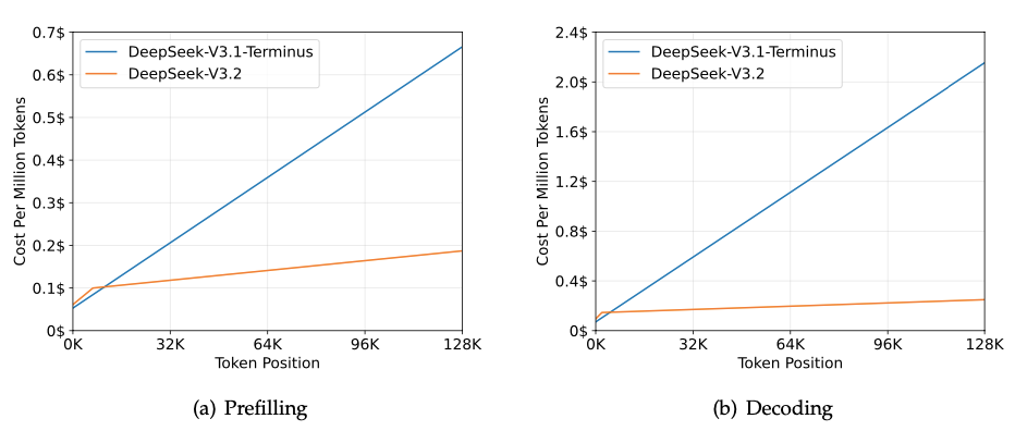 图注:DeepSeek-V3.1-Terminus 和 DeepSeek-V3.2 在 H800 集群上的推理成本