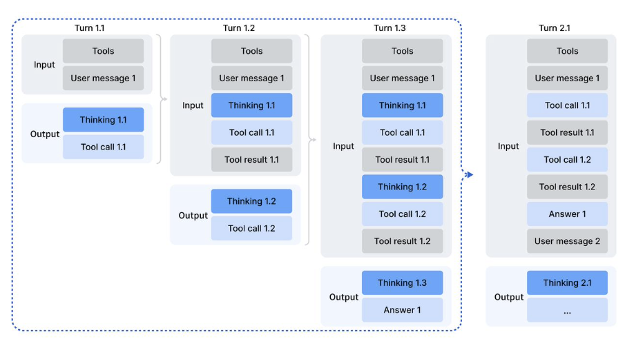本次 API 更新支持了 DeepSeek-V3.2 思考模式下的工具调用能力。当前在思考模式下,模型能够经过多轮的思考 + 工具调用,最终给出更详尽准确的回答。下图为思考模式下进行工具调用的 API 请求示意图: