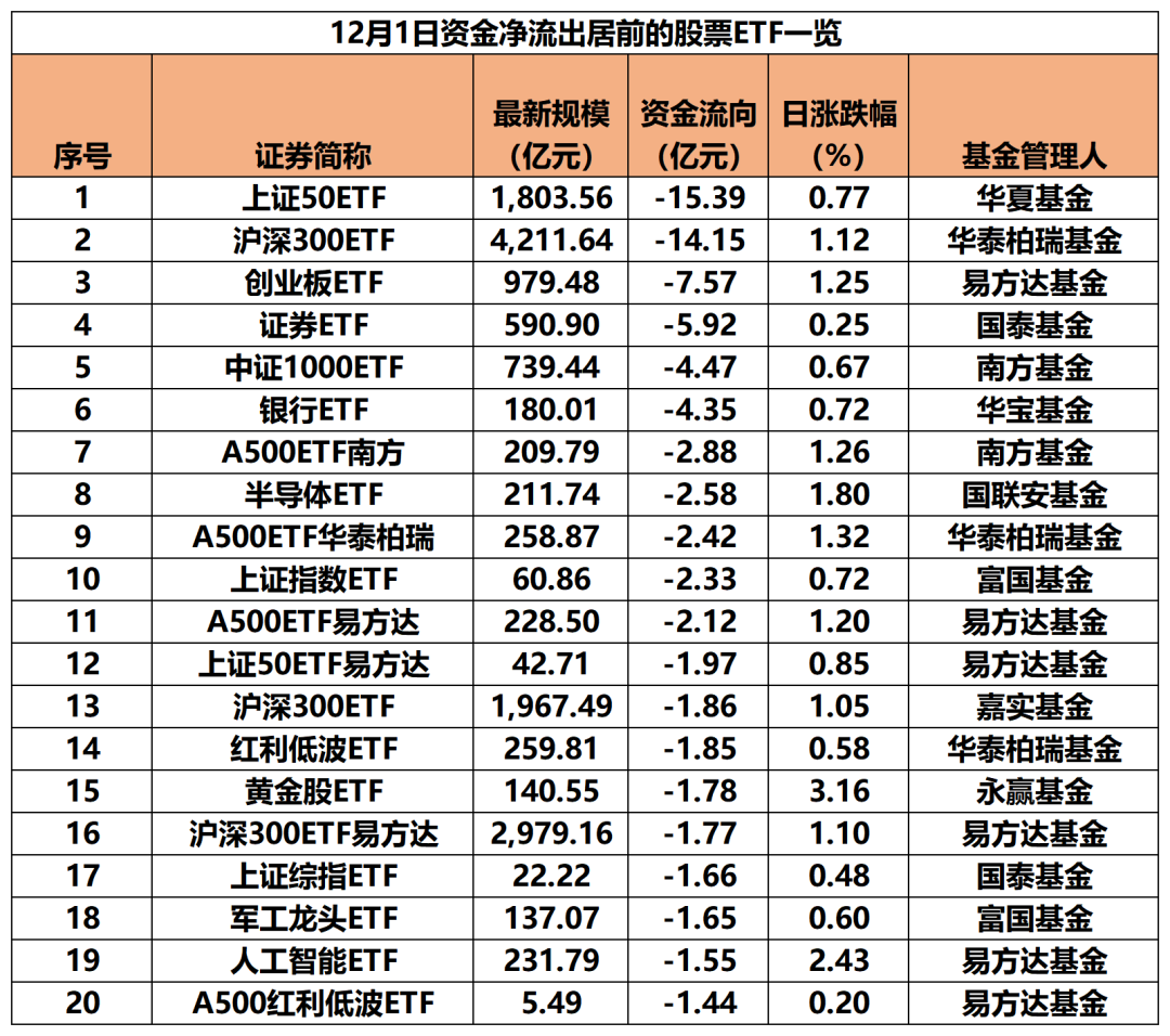 12 月 1 日,全市场股票 ETF(含跨境 ETF) 资金净流出 83.2 亿元。