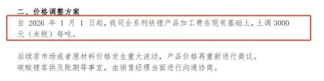 一家磷酸铁锂龙头企业在近期的价格调整方案中称,自 2026 年 1 月 1 日起,公司全系列铁锂产品加工费在现有基础上,上调 3000 元 (未税价) 每吨。后续若市场或者原材料价格发生重大波动,产品价格再重新进行商议。