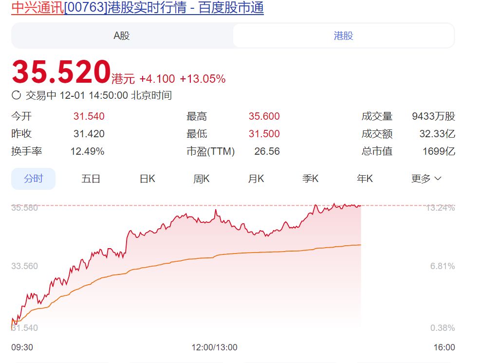 港股中兴通讯同样大幅上涨,截至发稿,最新股价报 35.52 港元/股,涨超 13%。