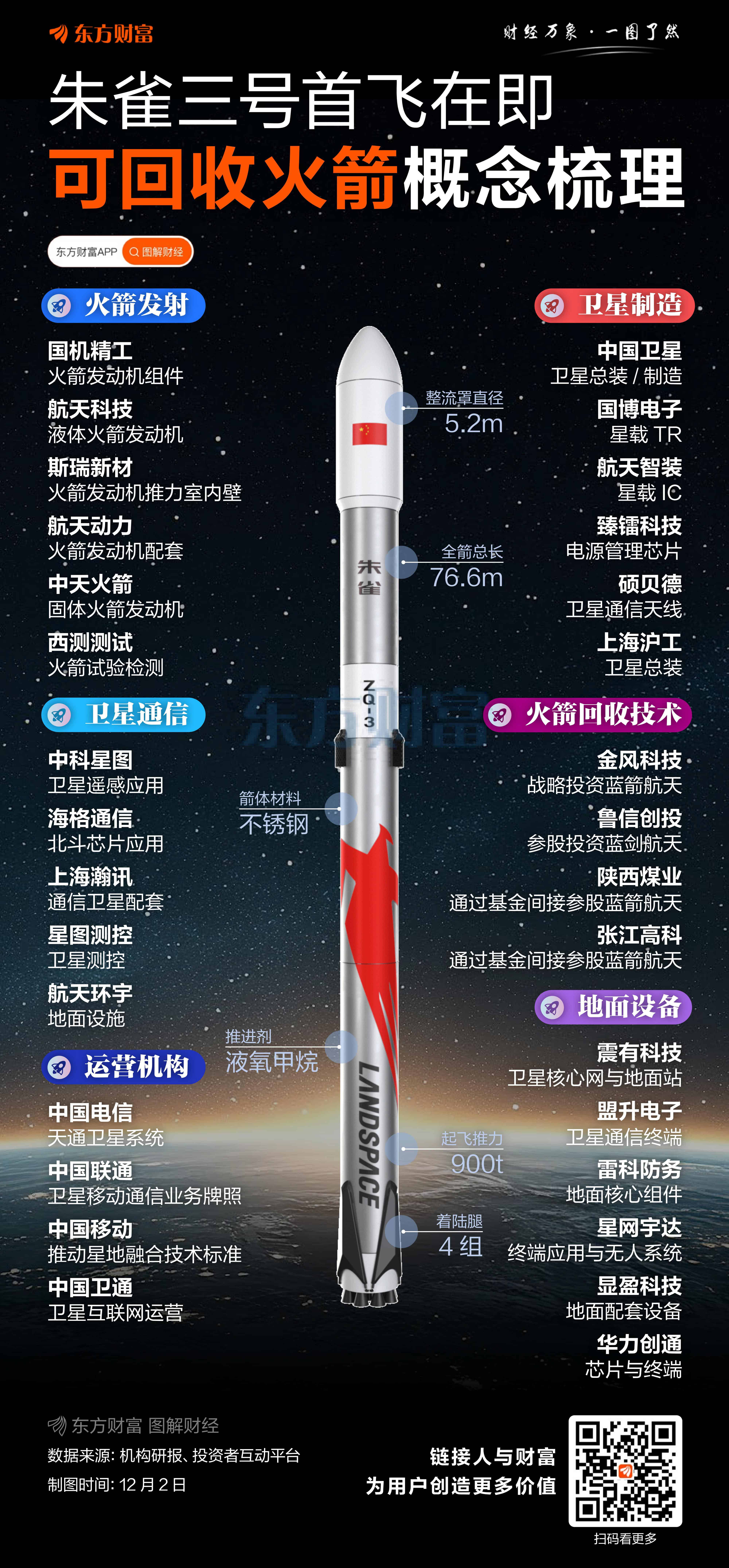 朱雀三号的首飞引发市场高度关注。如果其发射并实现成功回收,这对于中国航天具有里程碑式的重要意义,将使得中国成为美国之后,全球第二个掌握可重复使用火箭技术的国家。
