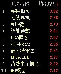 板块方面,屏下摄像、卫星互联网、消费电子、AI 手机、6G 概念等涨幅居前,电源设备、DRG/DIP、风电设备表现不佳,领跌市场。