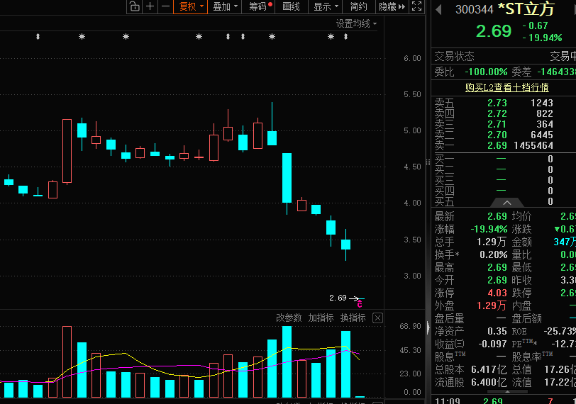 12 月 2 日,*ST 立方(300344) 复牌一字跌停,盘中跌停板封单超过 145 万手。目前公司股价为 2.69 元/股,逼近历史低点。