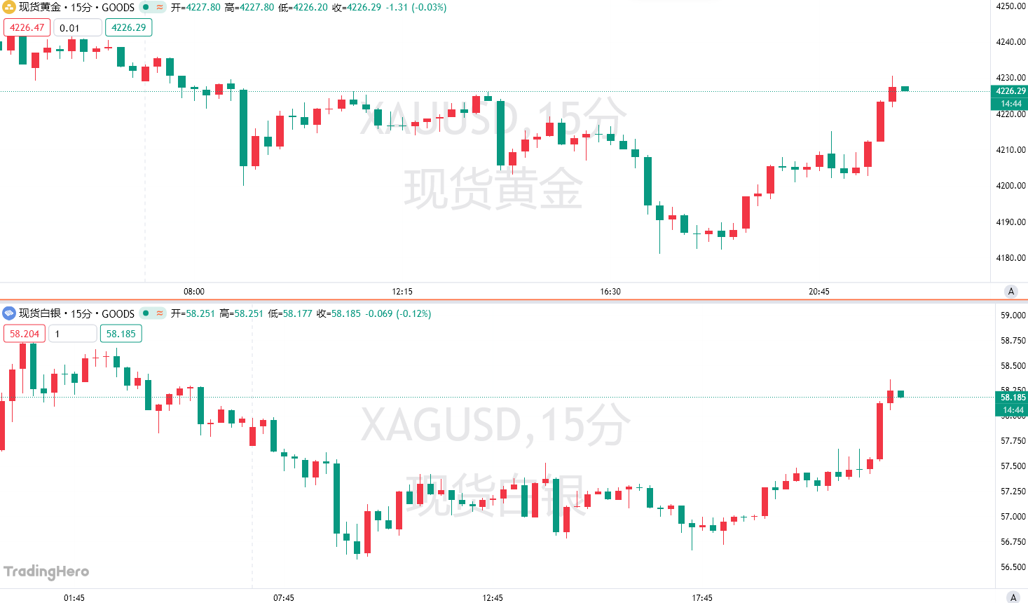 周二亚欧盘,白银在从历史高点回落,关键技术指标显示,为期六天的反弹已将其推入超买区域;黄金在前一交易日触及六周高位后也跌超 1%。然但在美盘前,白银收复日内全部失地,并冲上 58 美元上方,黄金也收复大部分失地。