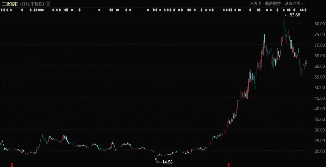 股价从今年 4 月 9 日 14 元 (前复权) 的低点,一路飙升到 10 月 30 日最高达到 83.88 元,不到 7 个月内暴涨 5 倍。