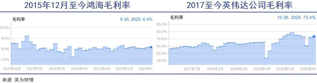 对比来看,全球 AI 总龙头英伟达最新财季毛利率高达 73.4%,是鸿海的 12 倍;同期净利润 319.1 亿美元,同比增长 65%,净利率高达 56%,是鸿海的 20 倍。
