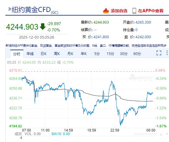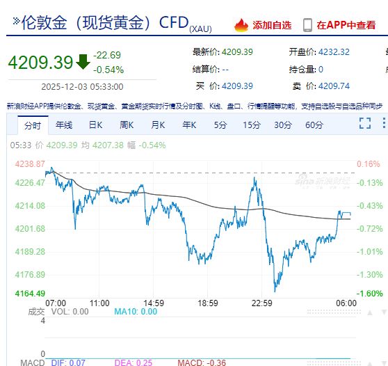 现货黄金收跌 0.54%,报 4209.39 美元/盎司。纽约黄金跌 0.70%。