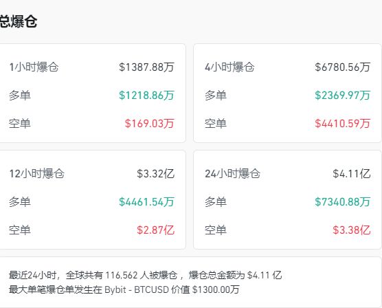 数据显示,24 小时,加密货币全网超 11 万人爆仓,4.11 亿美元 (约合人民币 29 亿元)「灰飞烟灭」。