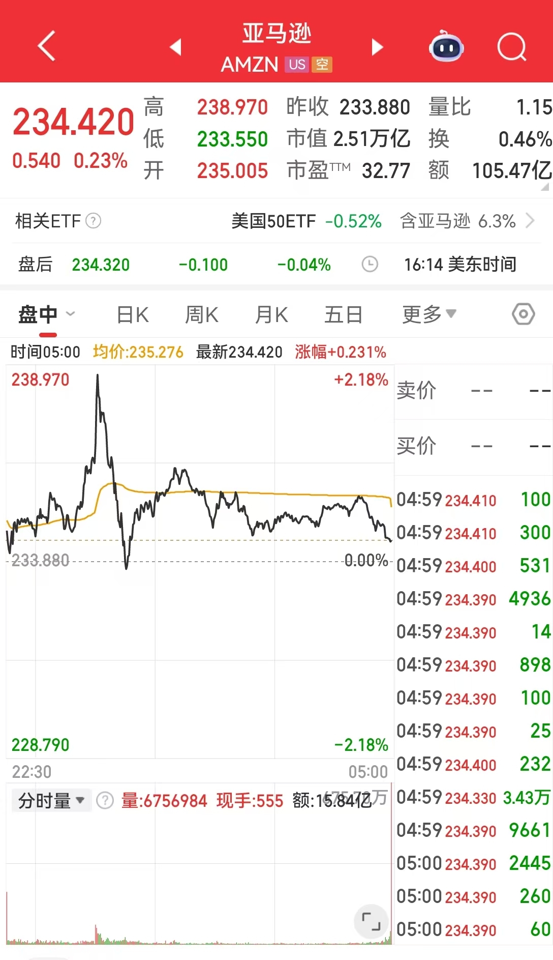 新 AI 芯片的消息公布后,亚马逊股价盘中一度涨超 2%,截至收盘报 234.42 美元,涨幅 0.23%,市值 2.51 万亿美元。