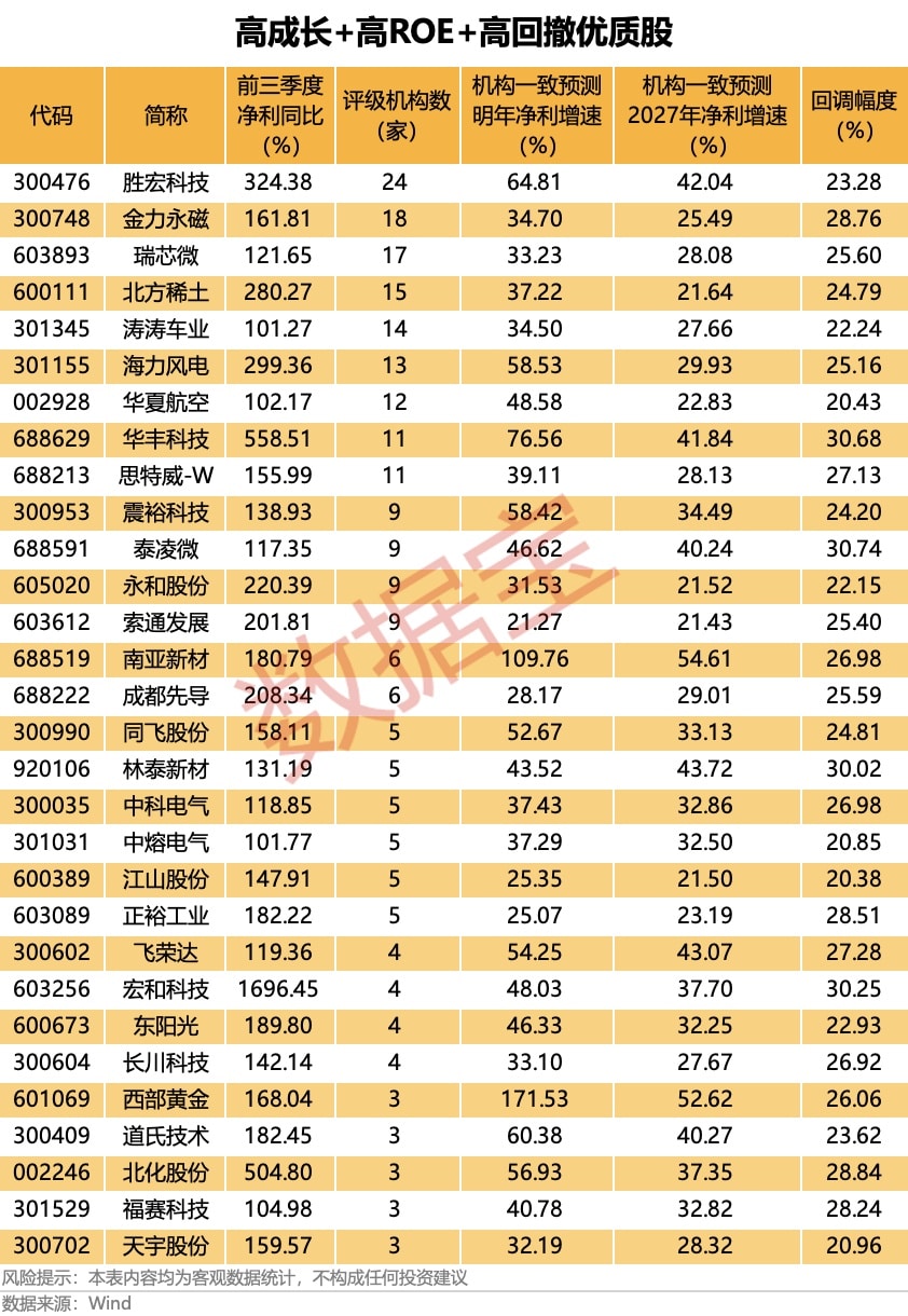 据证券时报·数据宝统计,3 家及以上机构评级且三季报净利同比翻倍增长、扣非平均净资产收益率超 5% 的个股中,有 30 只个股机构一致预测明后两年净利增速均超 20%,且最新价较年内高点回调超 20%。