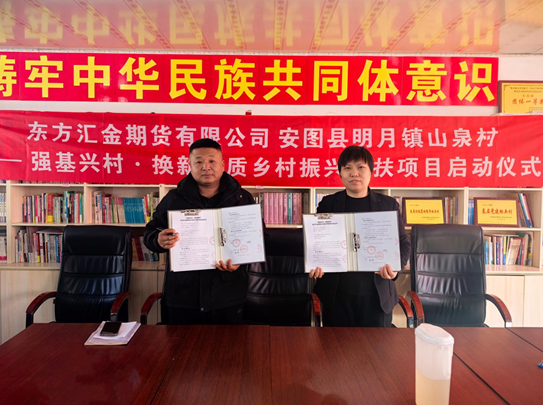 启动仪式上,东方汇金期货与山泉村签订了 《乡村振兴帮扶项目协议书》,并在现场捐赠 5.8 万元用于帮扶山泉村村部改造工程。东方汇金期货副总金萍奕在启动仪式上表示,乡村振兴是党中央着眼于实现 「两个一百年」 奋斗目标和中华民族伟大复兴中国梦作出的重大决策部署,山泉村作为定点帮扶地区之一,东方汇金期货从村部的实际需求出发,精准对接,为吉林省乡村振兴事业添砖加瓦。