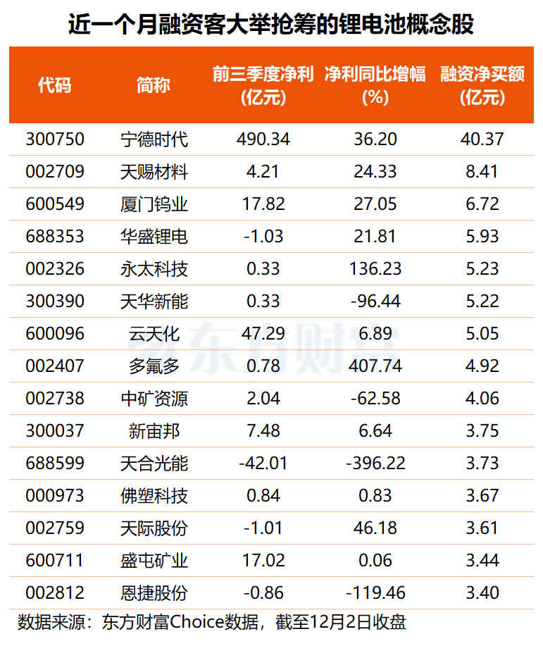 东方财富 Choice 数据显示,近一个月,多只锂电池概念股获杠杆资金加仓。其中,宁德时代融资净买额高达 40.37 亿元,天赐材料获抢筹 8.41 亿元,厦门钨业融资净买额约 6.72 亿元,华盛锂电、永太科技、天华新能、云天化等 4 股均获融资客超 5 亿元加仓。