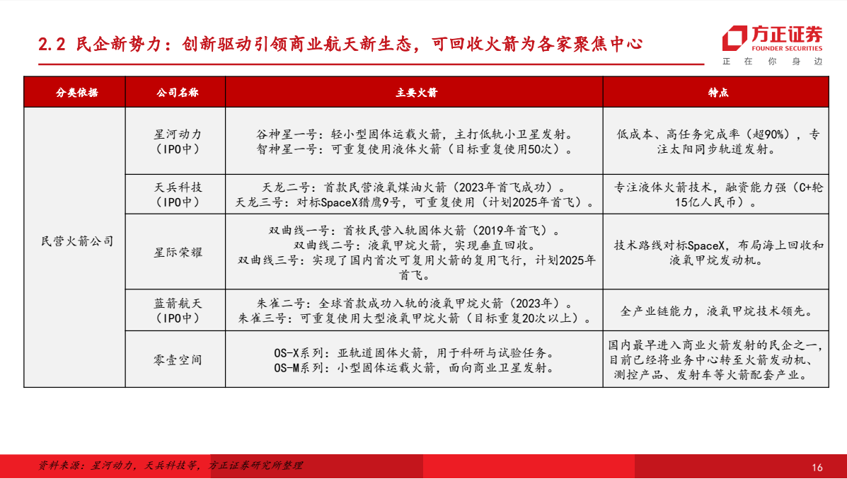 据方正证券统计,除蓝箭航天外,目前星河动力的智神星一号、天兵科技的天龙三号、星际荣耀的双曲线三号,东方空间的引力二号、三号,深蓝航天的星云一号、二号,中科宇航的力箭三号都将可回收视作重要目标。其中,力箭三号目标是重复 100 次,引力三号目标是全箭回收。