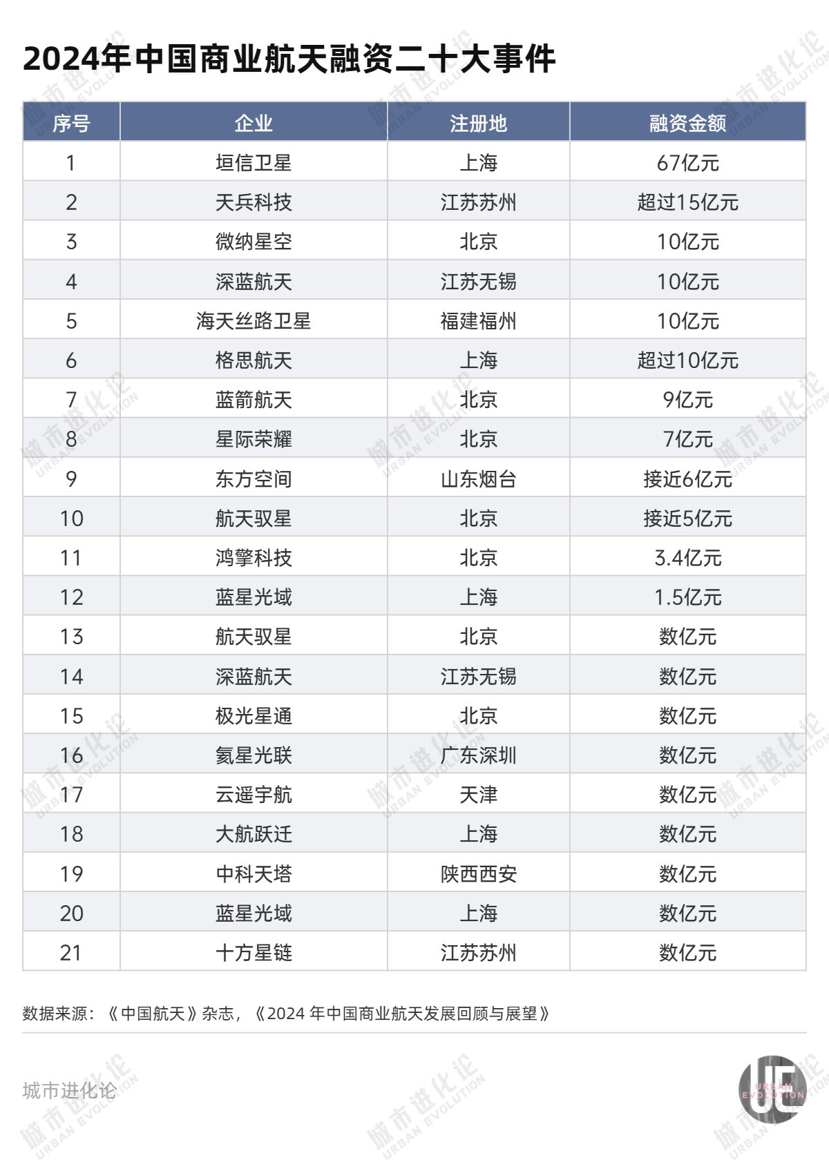 从融资来看,北京、上海等地也是重点区域。今年初,《中国航天》 杂志刊发的 《2024 年中国商业航天发展回顾与展望》 披露,2024 年我国商业航天领域共发生融资 52 起,合计披露融资金额 150 亿元,其中卫星运营、火箭制造和卫星制造领域融资金额分别占 43%、30%、16%。