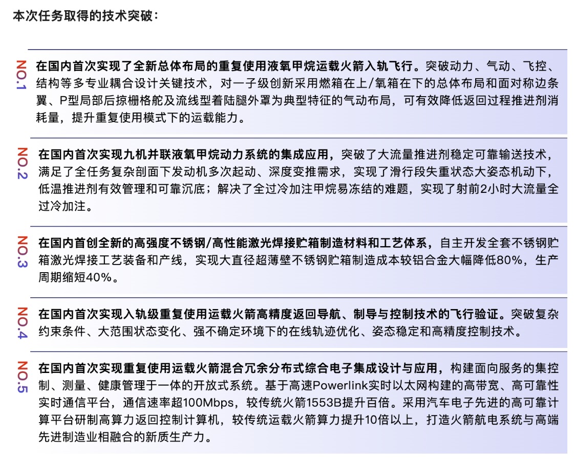 12 月 3 日,朱雀三号首飞后,蓝箭航天发文表示,根据飞行测量数据,火箭一子级在着陆段点火后出现异常,未实现在回收场坪的软着陆,残骸着陆于回收场坪边缘,回收试验失败,具体原因正在进一步排查中。不过本次任务五项技术取得 「国内首次」 突破——