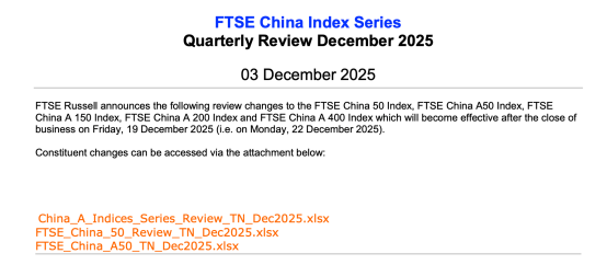 12 月 3 日,富时罗素宣布对富时中国 50 指数、富时中国 A50 指数、富时中国 A150 指数、富时中国 A200 指数、富时中国 A400 指数的审核变更。该变更将于 2025 年 12 月 19 日星期五收盘后生效。