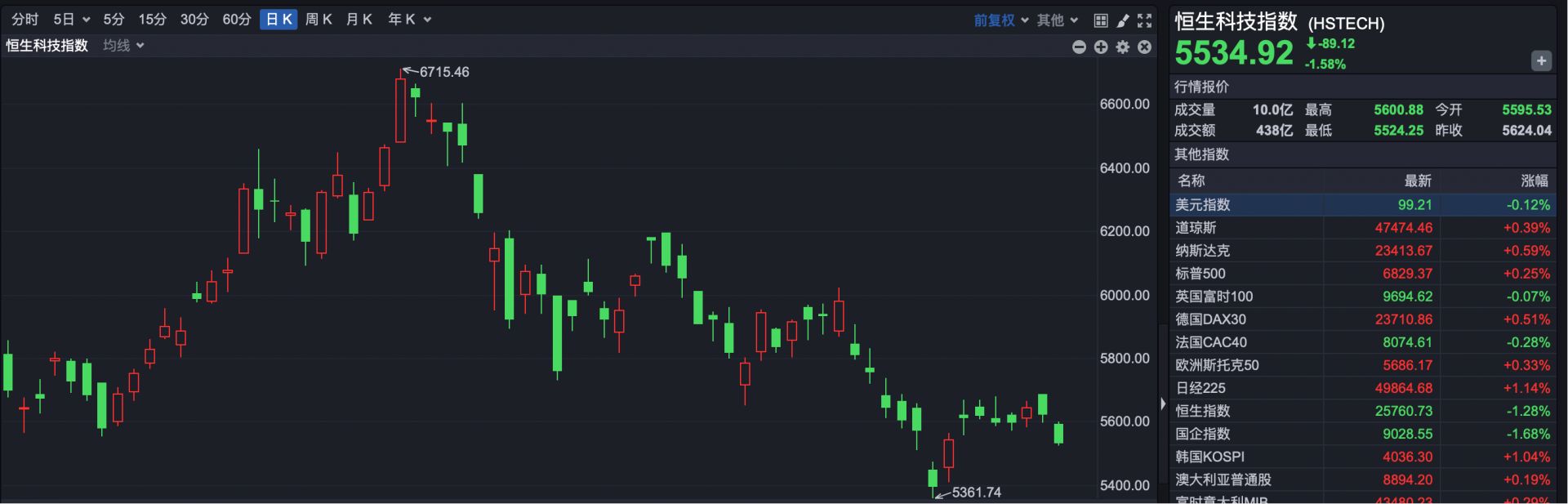 恒生科技指数报收于 5534.92 点,下跌 89.12 点,跌幅 1.58%。