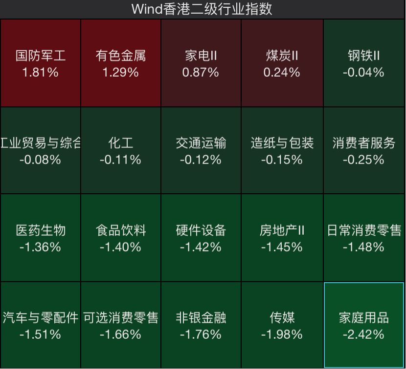 板块方面,截至收盘,仅有国防军工、有色金属、家电和煤炭板块上涨。家庭用品、传媒、非银金融、可选消费跌幅较大。