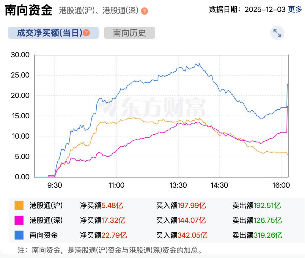资金方面,截至收盘,南向资金累计净买入港股超 22 亿港元。