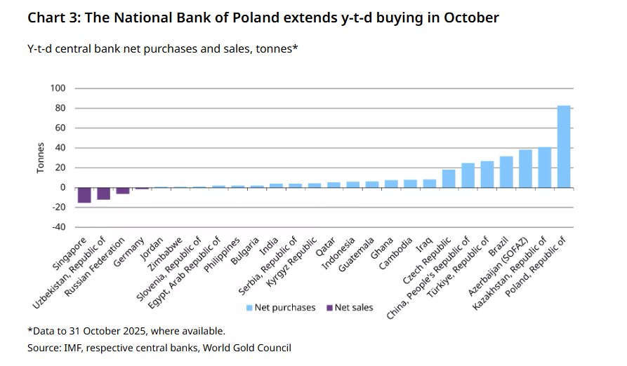 波兰国家银行自 5 月暂停购金后,于 10 月重返市场。该央行近期将黄金配置目标上调至 30%,当月购入 16 吨黄金,使其黄金储备增至 531 吨,按 10 月末价格计算,占总储备的 26%。