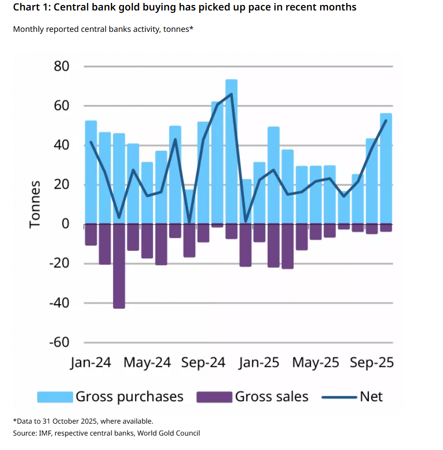根据世界黄金协会 (WGC) 的统计数据,10 月各国央行对黄金的需求依然强劲,净购金量达 53 吨,环比增长 36%,创下今年迄今为止最大的月度净需求,延续了全年的强劲态势。购金行为仍集中在少数央行,波兰国家银行 (National Bank of Poland) 当月再度活跃,成为领头羊。