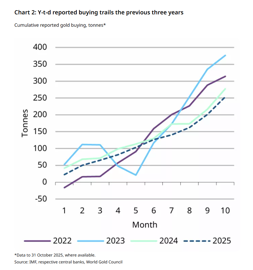 截至 10 月,今年以来央行已公布的净购金总量达 254 吨,相较于前三年增速有所放缓。这可能反映了金价走高带来的影响。即便如此,新兴市场央行的持续购金行为强烈表明这些购买是战略性而非投机主义的,凸显了在宏观经济不确定性持续存在的背景下,黄金的重要性。这一结论也得到 WGC 年度调查结果的支持。