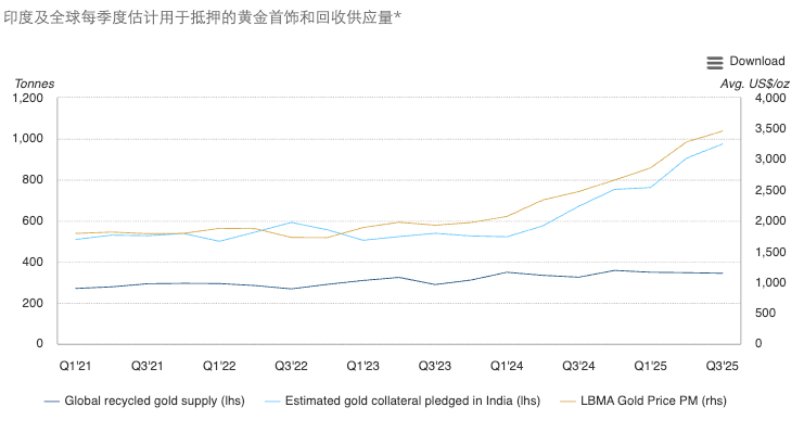 世界黄金协会指出,在印度,今年已有超过 200 吨黄金首饰通过正规渠道质押用于贷款,非正规渠道的规模甚至可能相当。如果回收量持续偏低,黄金作为抵押品将继续支撑价格。但如果印度经济显著放缓,可能触发黄金抵押物的被动清算,推高二级供应并对金价造成压力。在全球深度衰退等情景下,这种影响可能进一步外溢。
