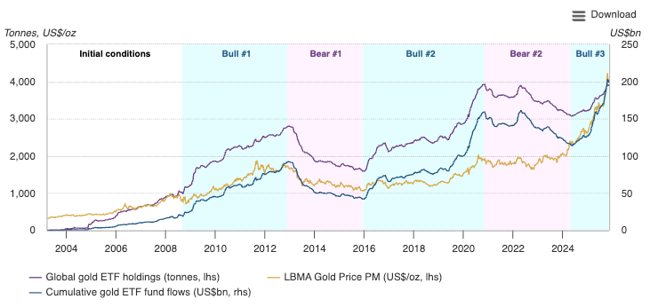 下图显示,本轮黄金上涨期间的资金流入仍低于过去几轮牛市。数据截至 2025 年 11 月 28 日。
